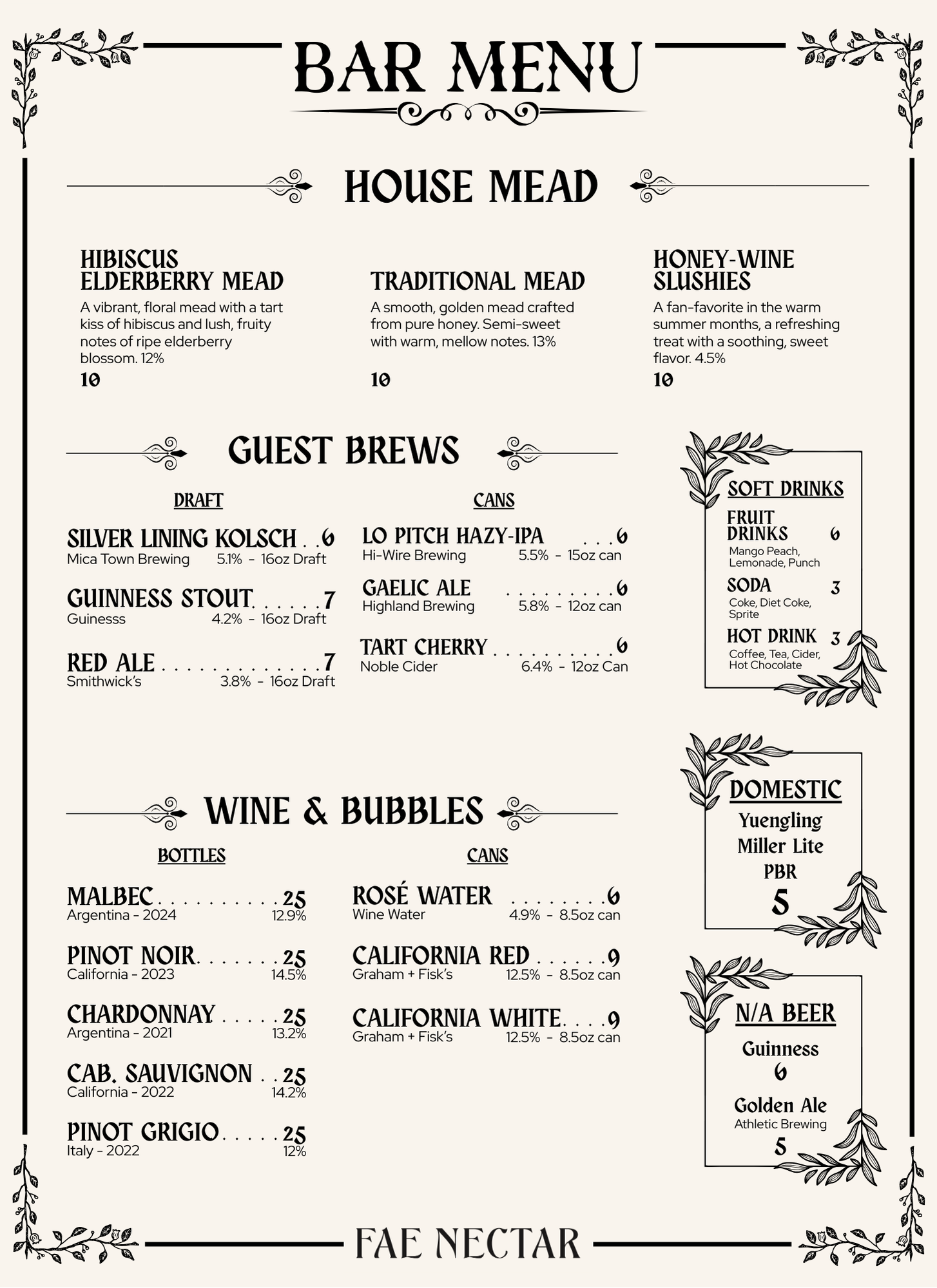 At the heart of Fae Nectar lies our Medieval Tavern, a cozy Olde-World hideaway where hearty fare and house-brewed mead bring people together in joyful celebration. With flickering lanterns, rustic charm, and relaxing music in the air, it’s the perfect spot to gather together, and raise a toast.