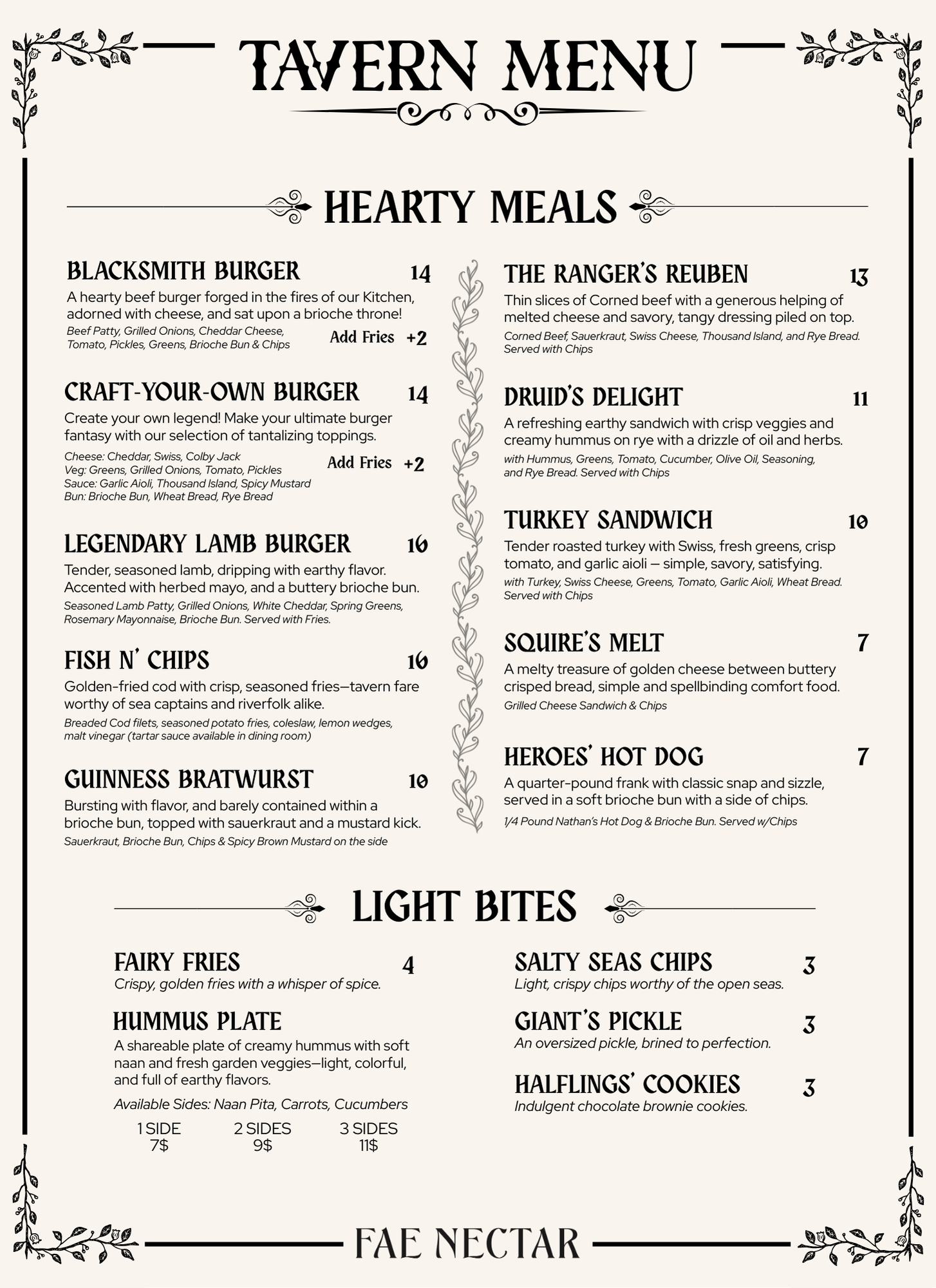 Our menu features tavern favorites with a touch of fantasy: juicy burgers, sizzling bratwursts, stacked sandwiches, crispy fries, and shareable snacks like a giant pickle or a heartening hummus plate with warm pita. Behind the bar, you’ll find our legendary mead with a host of delicate flavors that will entice any palette, as well as a curated selection of local beers, wines, and ciders. For those who prefer a dry cup, we also offer non-alcoholic beverages, including craft sodas, sparkling waters, and more.